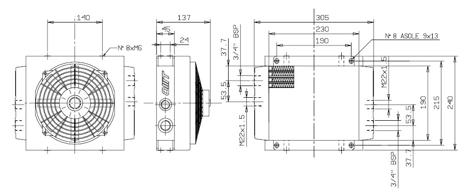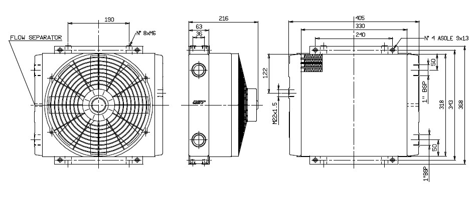 Мы рекомендуем устанавливать байпасный клапан параллельно теплообменнику для его защиты от скачков давления во время запуска гидросистемы. Обязательно убедитесь, что потоку воздуха, выходящего из теплообменника, ничего не препятствует.