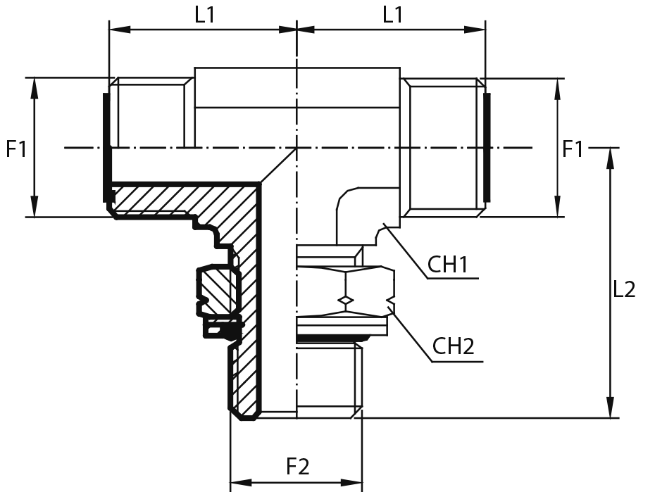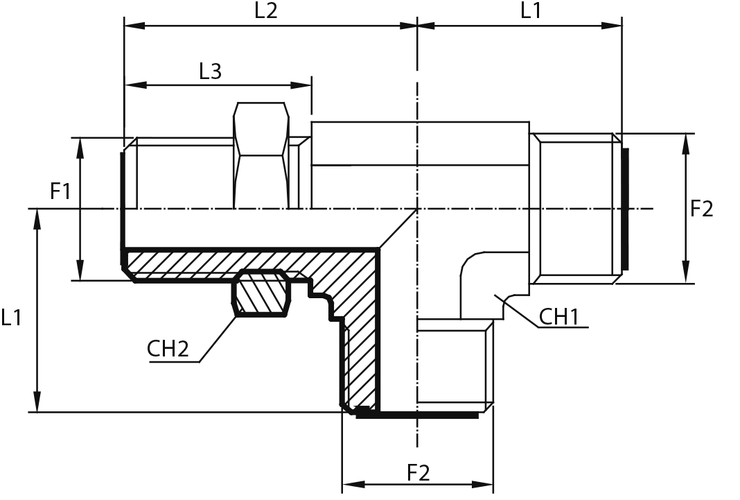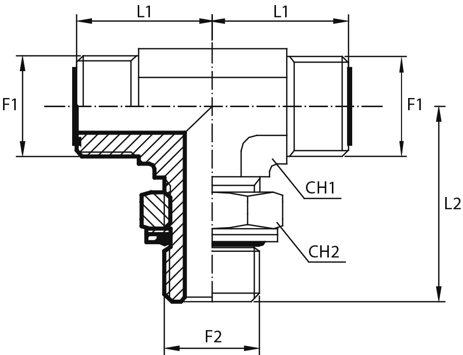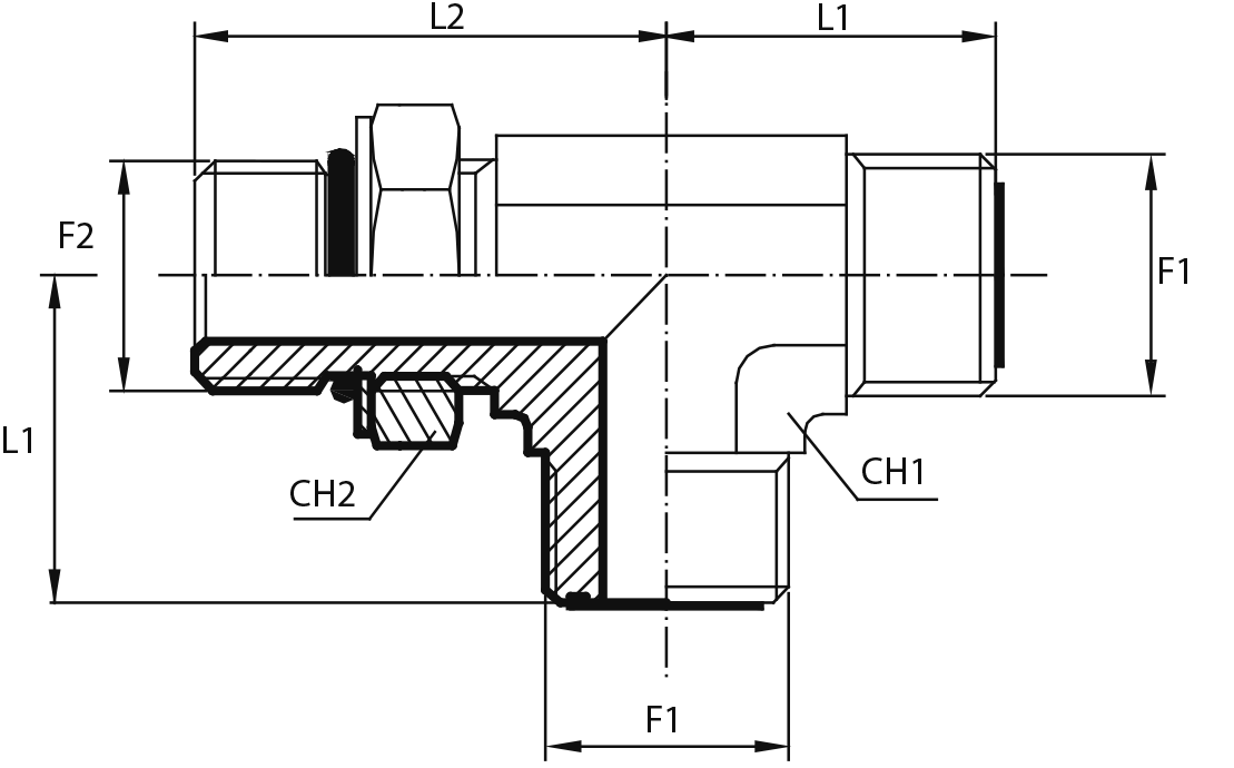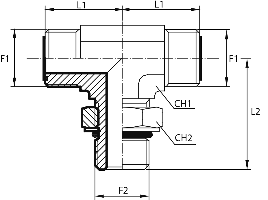 Адаптер тройник ORFS(ш) 9/16" - Metric(ш) 10X1 o.r.+ контргайка - ORFS(ш) 9/16"