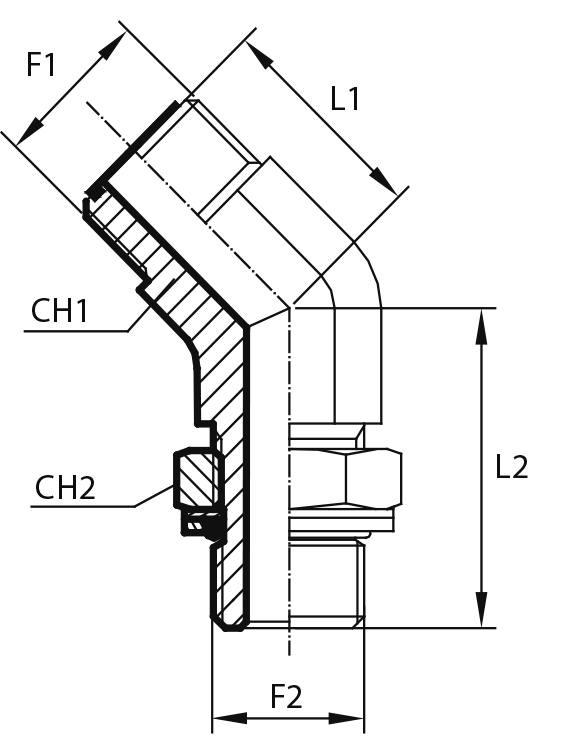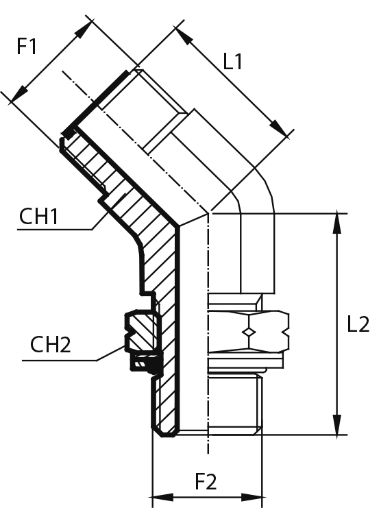 Адаптер 45°ORFS(ш) 9/16" - Metric(ш)10X1 o.r.+ контргайка