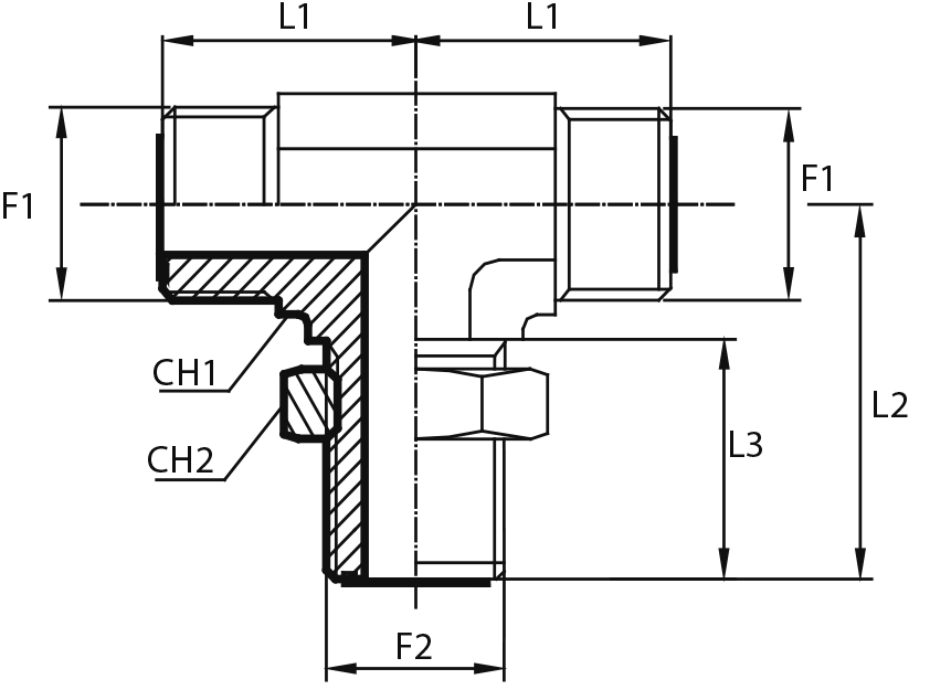 Адаптер тройник ORFS(ш) 9/16" - ORFS(ш) 9/16" - ORFS(г) 9/16"
