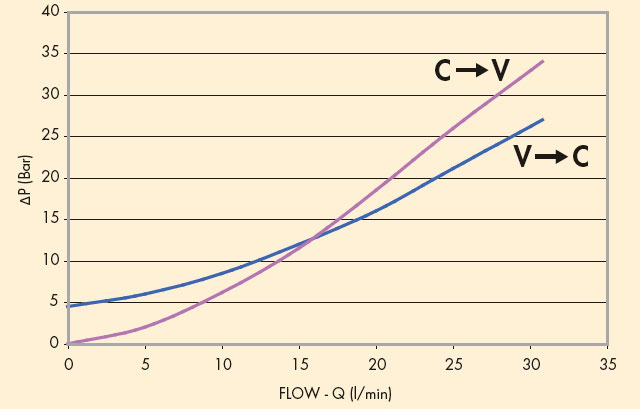 Клапан испольузется для удержания гидравлических двигателей в статическом положении под нагрузкой. Гидравлическая жидкость блокируется в полостях гидродвигателей C1 и С2, при отсутствии давления в линии V1 и V2.